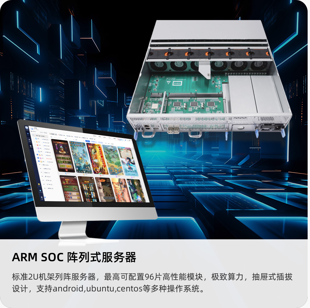 ? ? ? ? ? ?標準2U機架列陣服務器,最高可配置96片高性能模塊,極致算力,抽屜式插拔設計,支持安卓android、unbuntu、centos等多種操作系統。